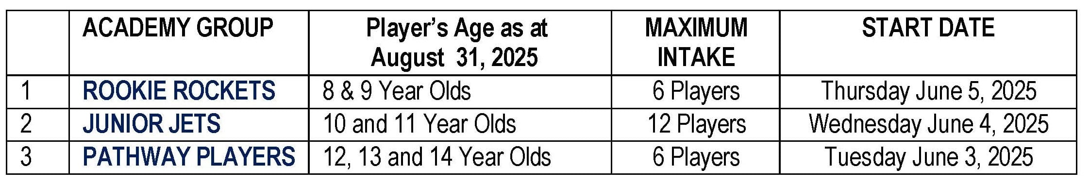 In 2025 there are 3 separate groups within the Victorian Junior Cricket Academy based on the player's age as at August 31, 2025: